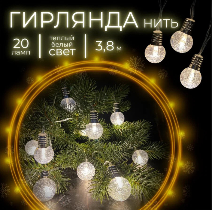 Гирлянда LED Гладкие шарики на батарейках, теплый белый свет, 20 ламп, 8 функций