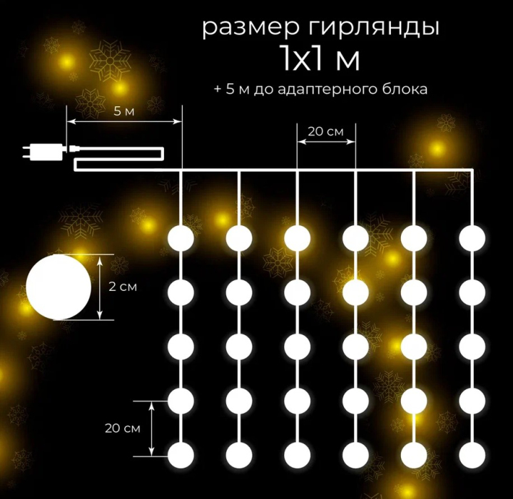 Гирлянда-занавес LED Шар, теплый белый свет, 30 ламп, 8 функций, 100х100 см
